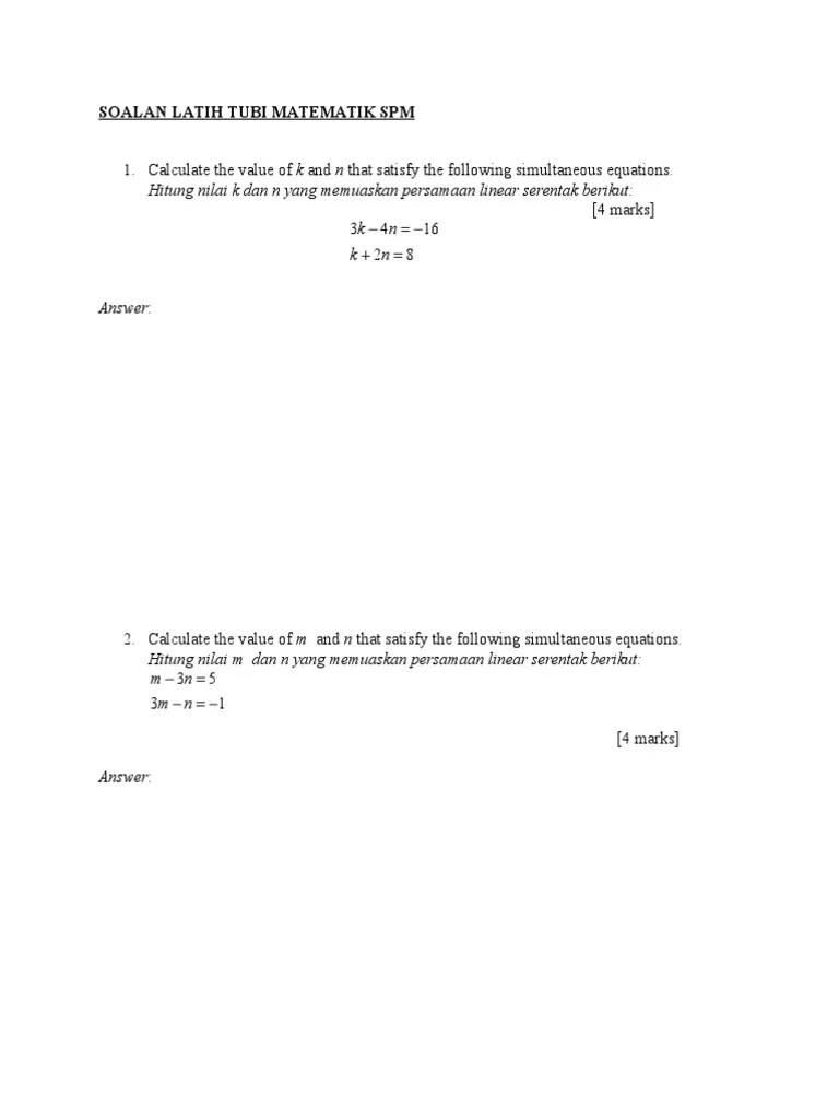 Himpunan pelbagai latihan matematik tingkatan 2 yang power khas untuk guru guru cetakkan pendidikan abad ke 21. Bulatkan semua persamaan linear dalam yang 4. You can do the exercises online or download the worksheet as pdf. Module 1 simultenous linear and equations equations applied mathematics.